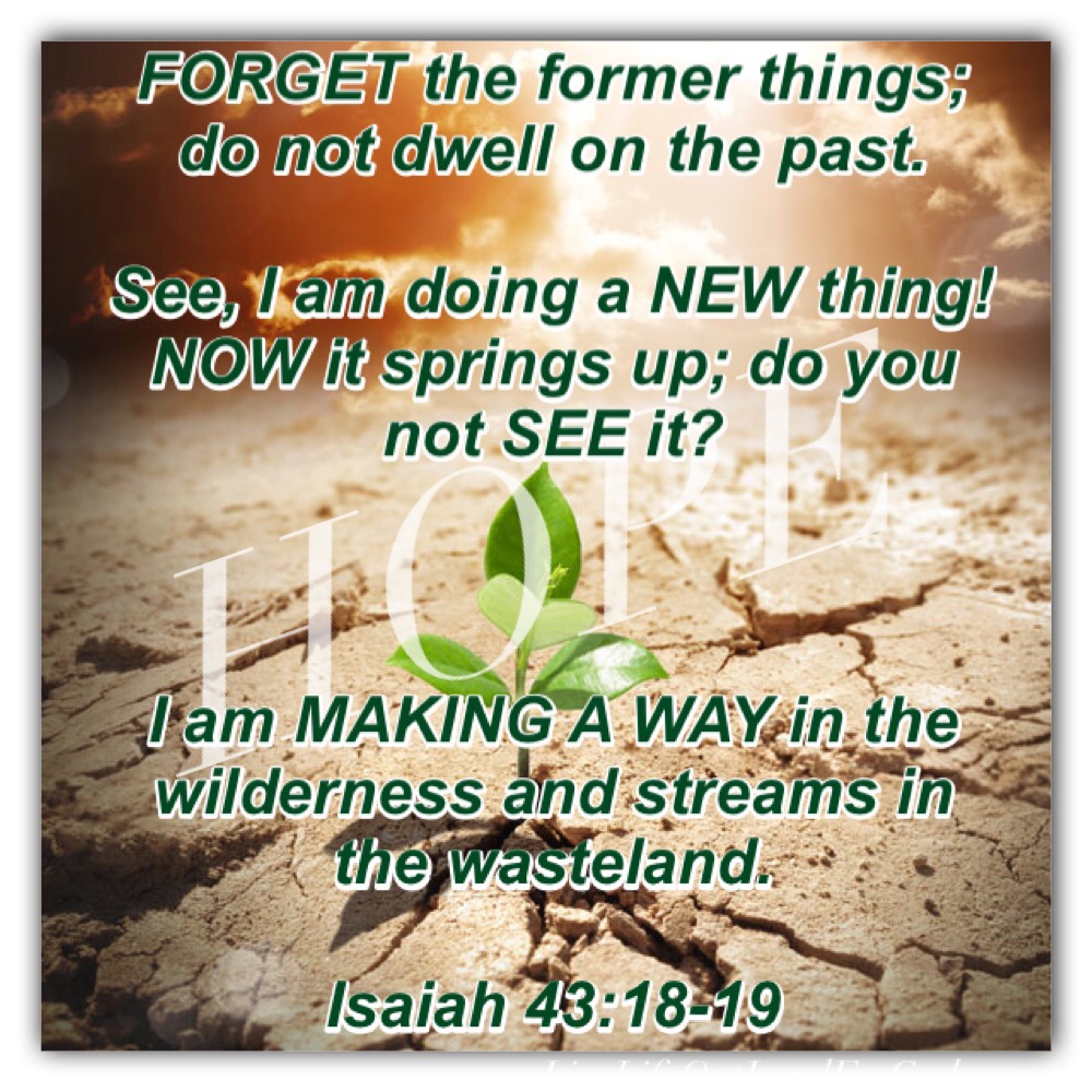 Isaiah 43:18-19 “But forget all that—it is nothing compared to what I am going to do. For I am about to do something new.See, I have already begun! Do you not see it?I will make a pathway through the wilderness.I will create rivers in the dry wasteland.