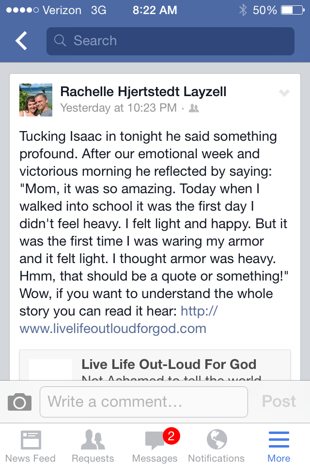 I started off by having him read the post above. When he was finished he said, “WOW” in awe. After a couple minutes I asked him what he thought. He said it is just hitting him really hard and he wants to let it sink in. I then talked about the post and what took place in him and me when we allowed other peoples junk to affect us because our armor wasn’t on. We were not actively walking in the spirit and renewing our mind. That he is surrounded by a new group of very curious kids who are engaging in activities that do not please The Lord. That he needs to be aware of his sensitivity to others and not be influenced by them BUT be the one INFLUENCING THEM!