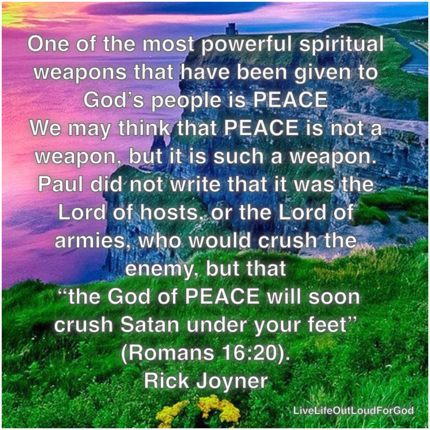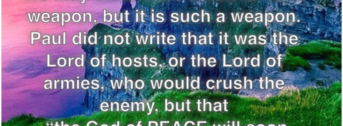 “One of the most powerful spiritual weapons that have been given to God’s people is Peace. We may think that Peace is not a weapon, but it is such a weapon. Paul did not write that is was the Lord of Host or Lord of armies who would crush the enemy, but that “the God of PEACE will soon crush Satan under your feet” Romans 16:20″ ~ Rick Joyner