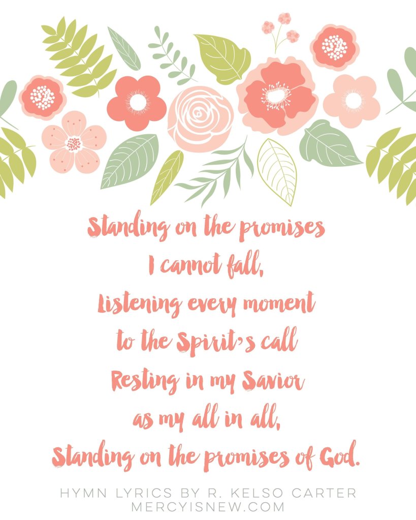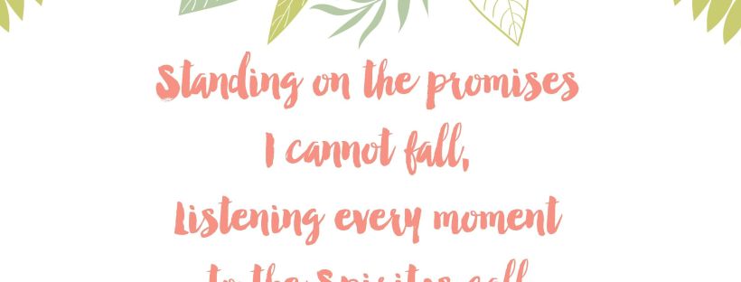 Standing on the promises of Christ my King Through eternal ages let his praises ring Glory in the highest, I will shout and sing Standing on the promises of GodStanding, standing Standing on the promises of God my Savior Standing, standing I’m standing on the promises of GodStanding on the promises, I cannot fall Listening every moment to the Spirit’s call Resting in my Savior as my all in all Standing on the promises of GodStanding, standing Standing on the promises of Christ my Savior Standing, standing I’m standing on the promises of God