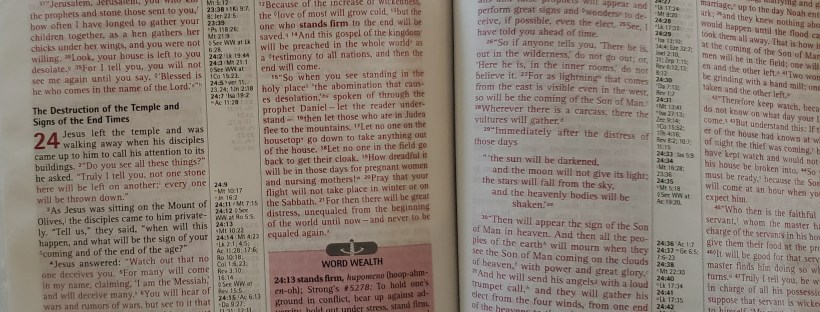 Wow, Matthew 24:13 jumped off the page this morning. Especially the definition of STAND Firm. So HOW do we do that when everything appears chaotic around us? It starts by knowing who we stand firm with! The character and words of the Father, Son and Holy Spirit are unchangeable. His words Always come to pass. Maybe not in our timing, but his Promises are true. The word of God, the Bible is our firm foundation. It is not a book of nice stories, it is the infallible words of God with accurate historical facts. It is our rock and our source. It never changes.